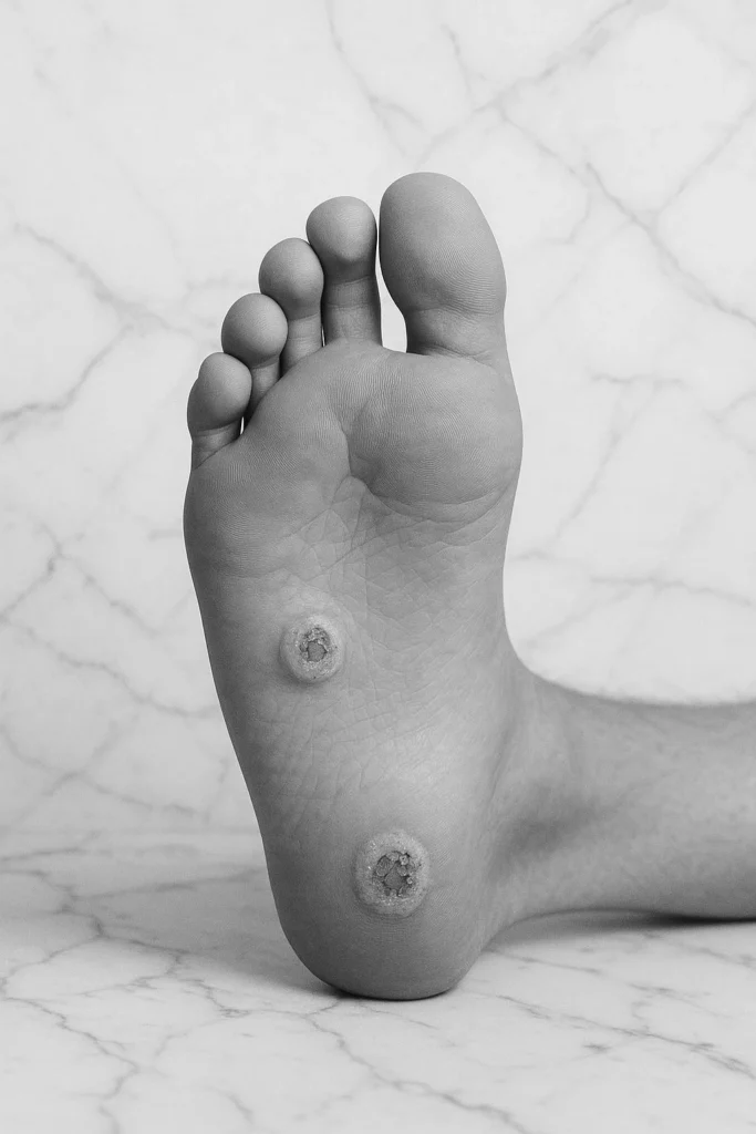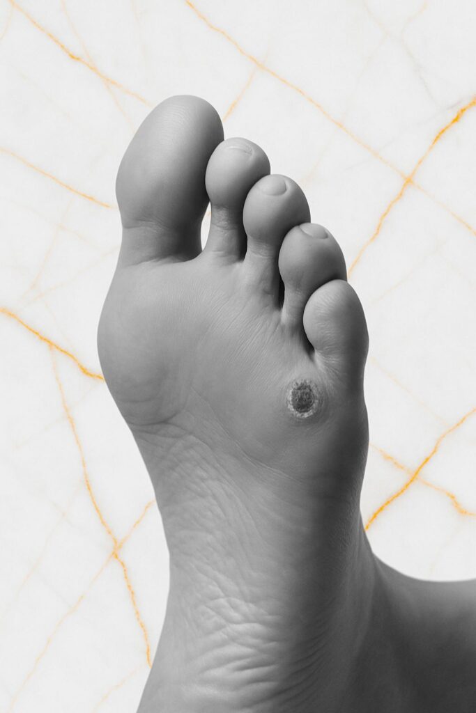 - Apparence : Les verrues plantaires sont souvent rugueuses, granuleuses et peuvent avoir de petites taches noires (vaisseaux sanguins coagulés).