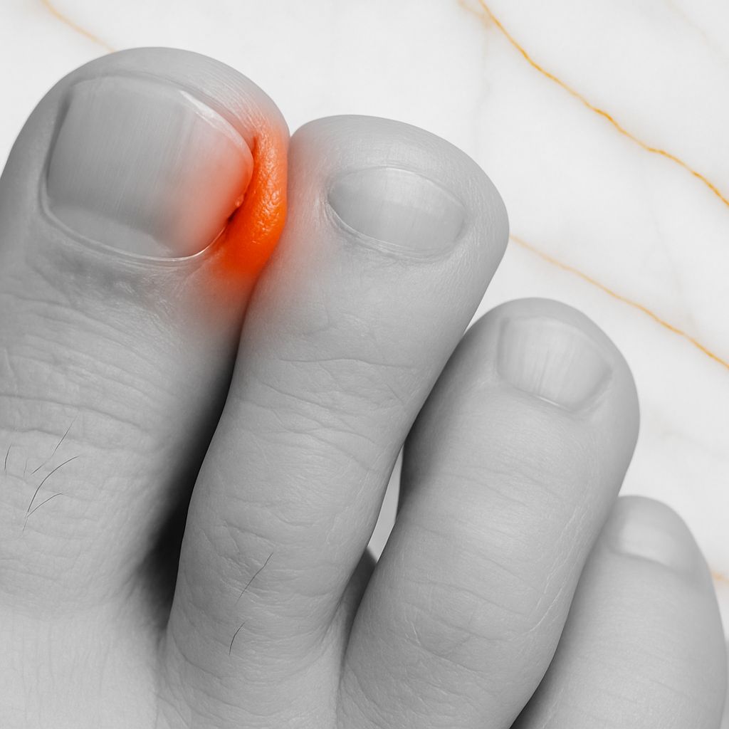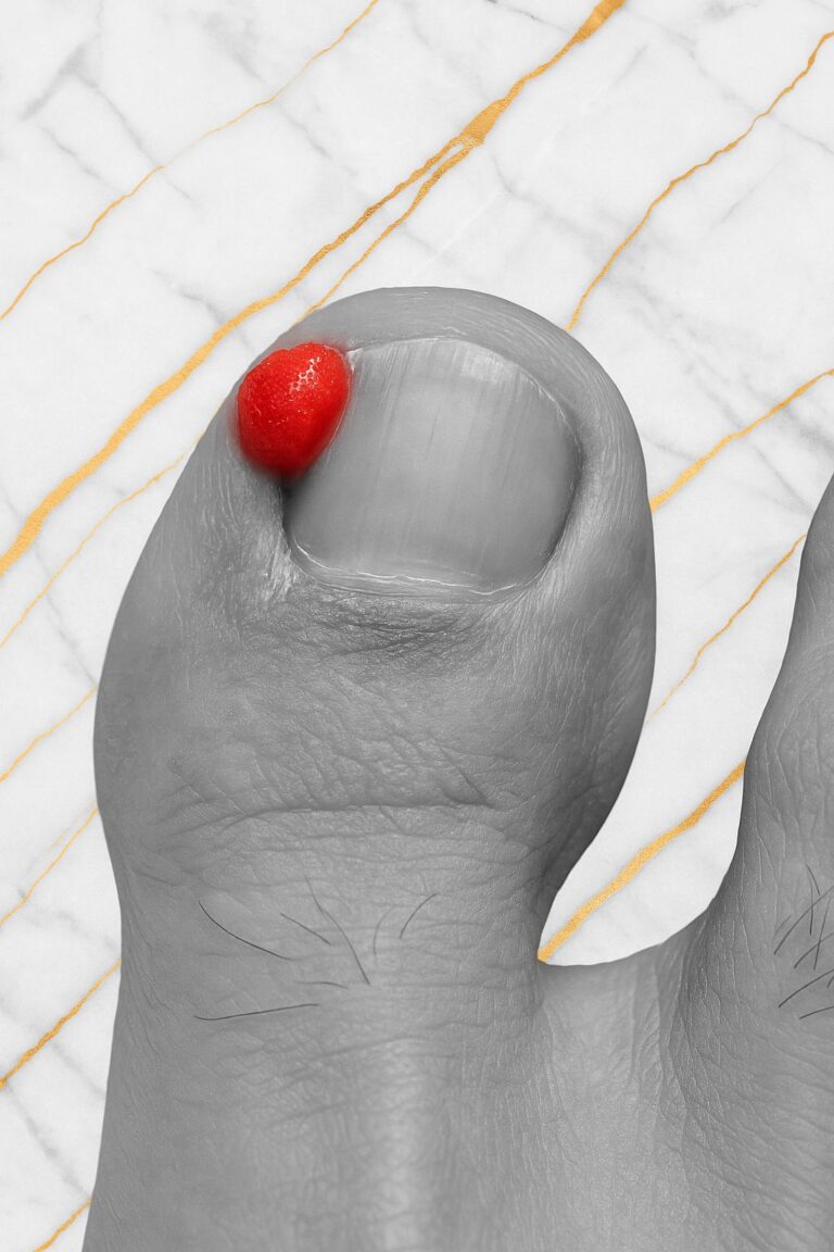 - Possible infection locale ou réaction à un conflit ongulaire (ongle qui pousse dans la peau).