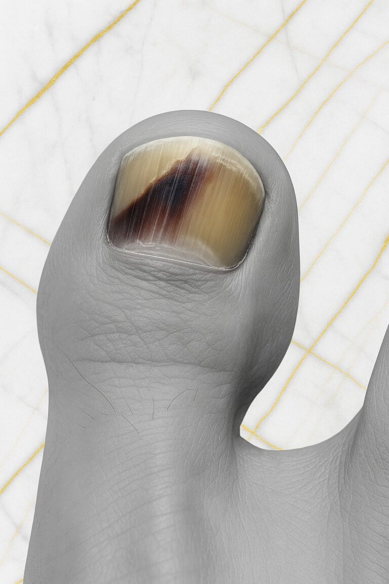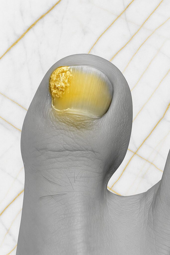 Cette image illustre une mycose unguéale associée à un traumatisme de l’ongle du gros orteil. La plaque unguéale présente une décoloration brun-noir caractéristique, conséquence de microtraumatismes répétés ou d’un choc direct ayant fragilisé l’ongle. Ce type de mycose peut entraîner un épaississement, une fragilité accrue et une déformation progressive de l’ongle. Une prise en charge précoce en podologie est essentielle pour éviter la propagation fongique et retrouver un ongle sain